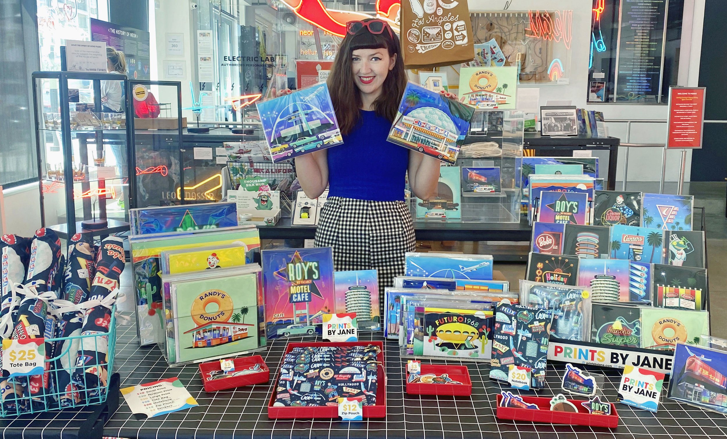 You can find Prints by Jane for sale in the gift shop of the Museum of Neon Art in Los Angeles.